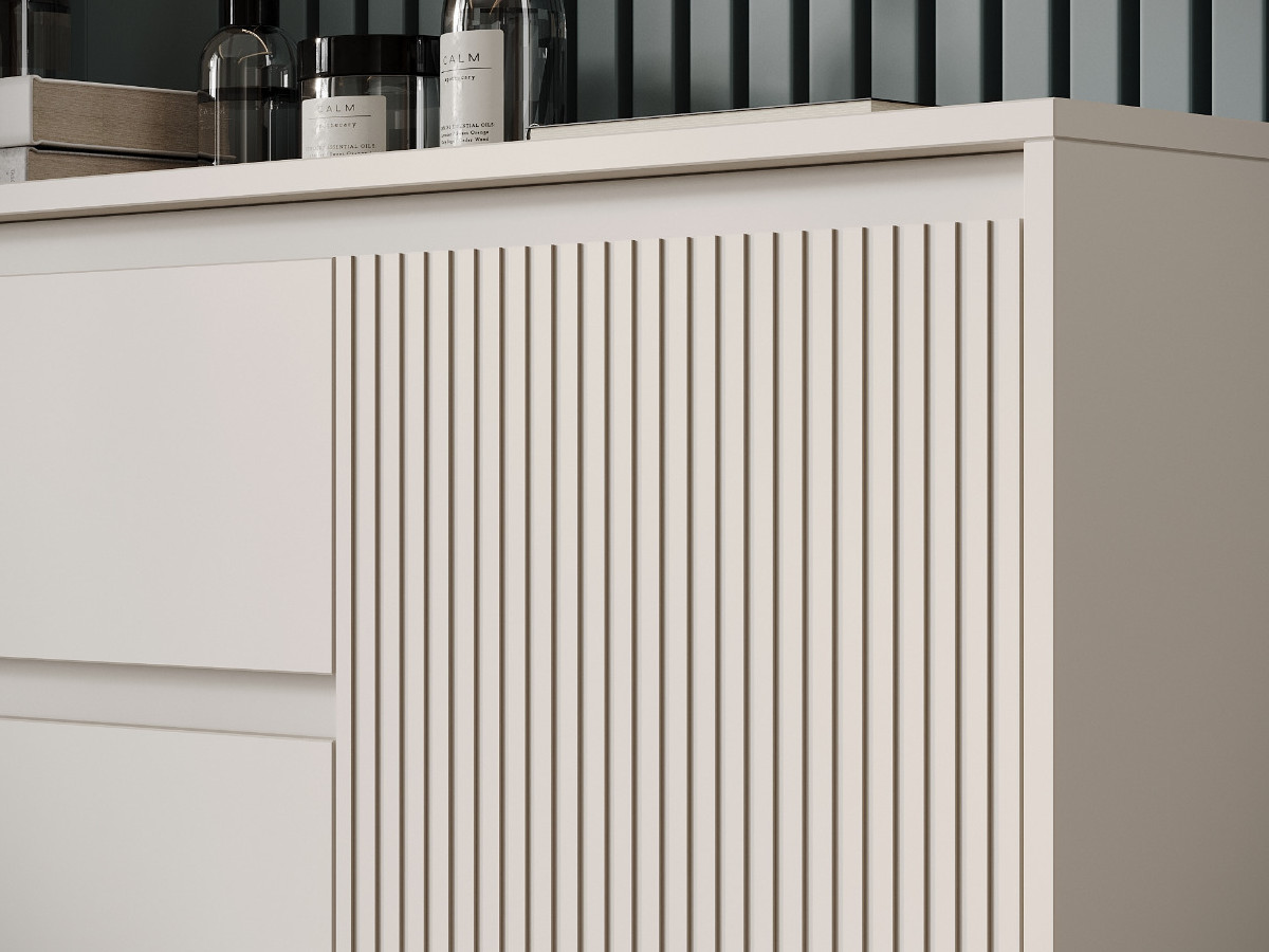 - Створки комода изготовлены из плиты МДФ 16мм и облицованы пленкой ПВХ. Для открывания створок предусмотрен зазор между фасадом и крышкой тумбы 30мм. Зазор закрыт изнутри планкой ЛДСП. За фасадами расположены полки съёмные, которые делят внутреннее пространство на 2 равные части Д.382 х В.282 х Г.358 мм.