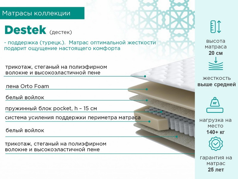 Несъемный чехол верх — трикотаж, стеганный на полиэфирном волокне и пене Orto Foam, нижняя часть — жаккард, стеганный на полиэфирном волокне.