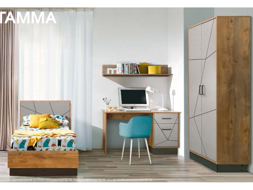Цена за комплект: Кровать одинарная 54.17, Стол письменный 54.18, Полка навесная 54.09, Шкаф комбинированный 54.14