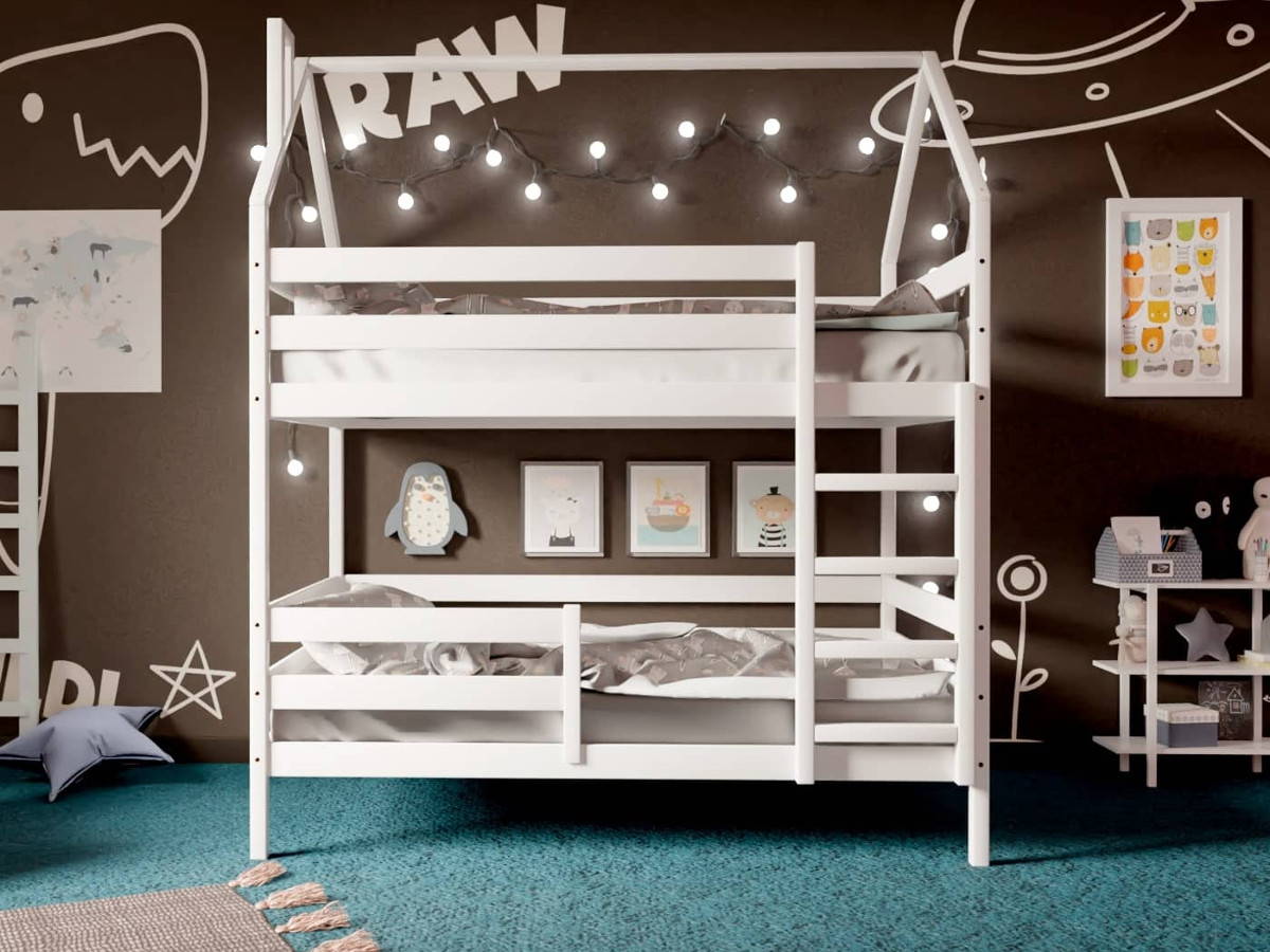 Передний бортик (съёмный, высота 39 см) на нижнем ярусе и лестница — универсальные, установка слева/справа.
