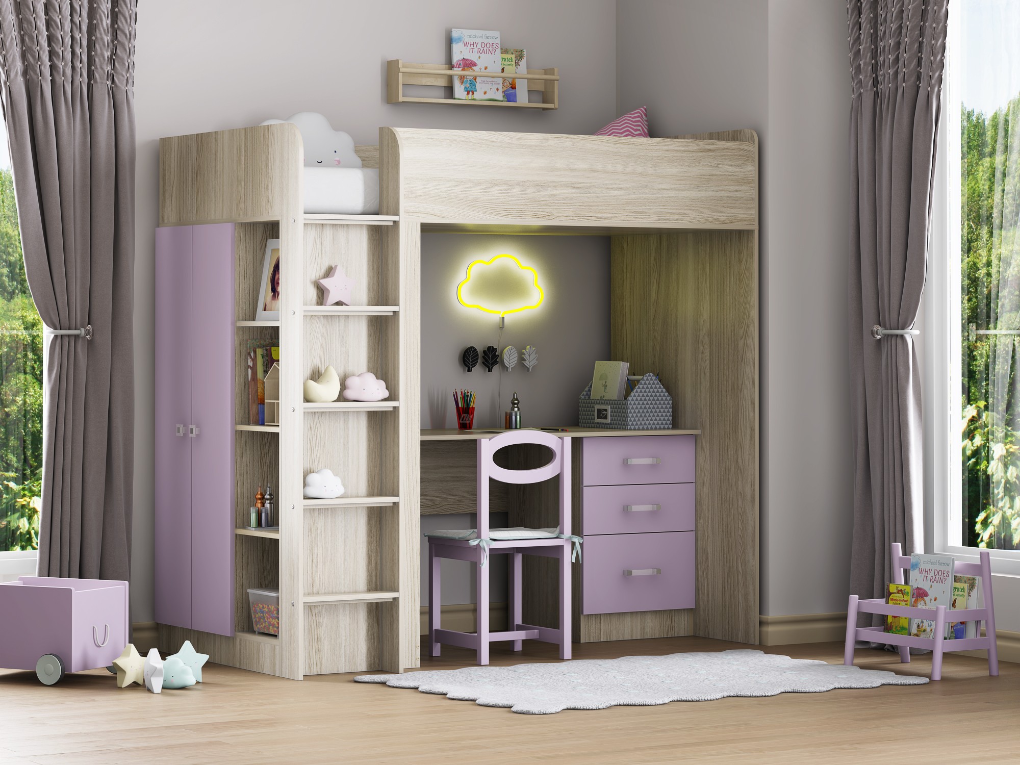- Кровать чердак Теремок 3 Фиолетовый