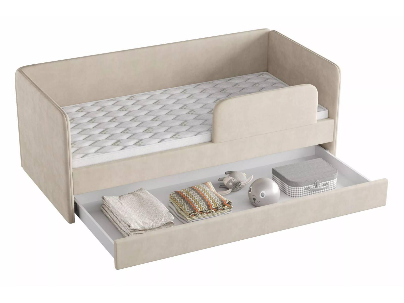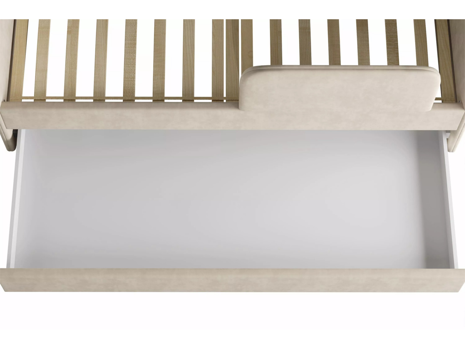 Выдвижной ящик можно использовать в качестве дополнительного спального места (разместив дополнительный беспружинный матрас 1900 х 800 х 140 мм) или для хранения белья и игрушек.