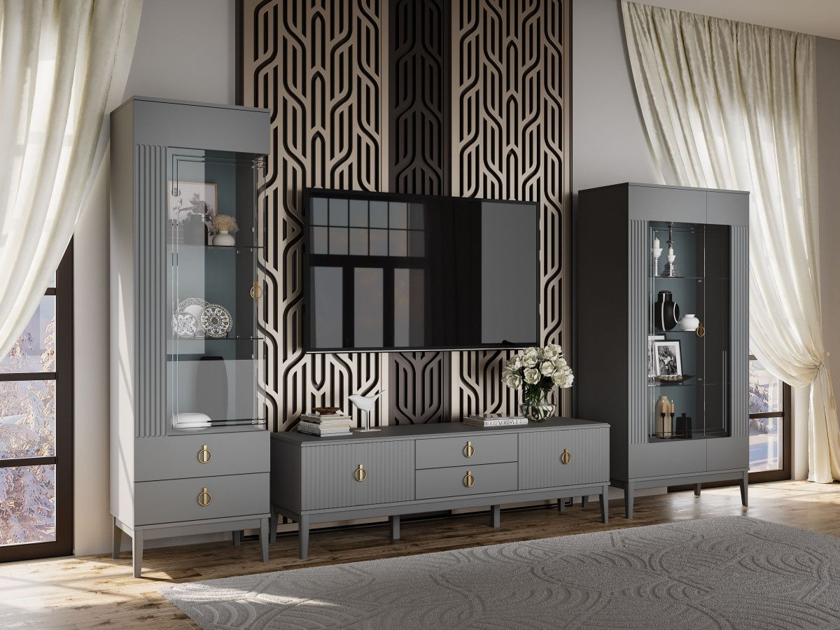 Цена указана за комплектацию на фото: Шкаф с витриной 1-дв. Левый, Тумба ТВ, Шкаф с витриной 2-дверный