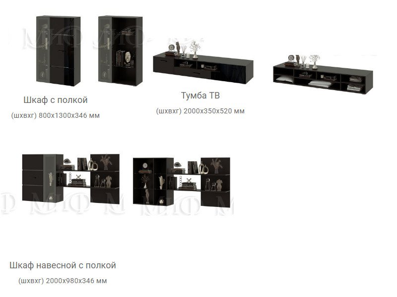 Цена указана за комплектацию на фото: Шкаф с полками, Тумба ТВ, Шкаф навесной с полкой