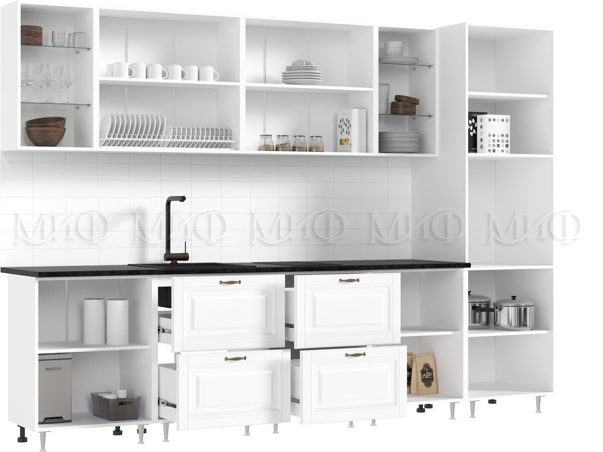 - Кухня Престиж 3000 мм Компоновка №1 Браш Вайт/Прайм орех