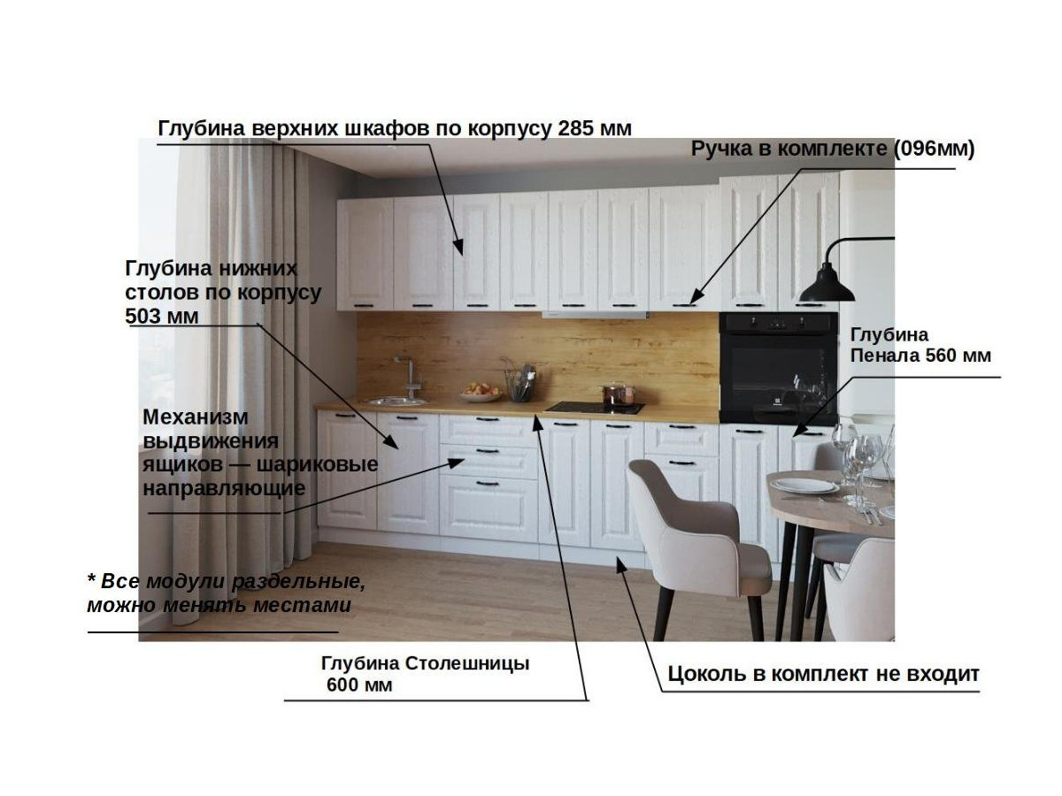 Кухонная мойка, стеновая панель, посудосушитель, планки для столешницы в комплект не входят.