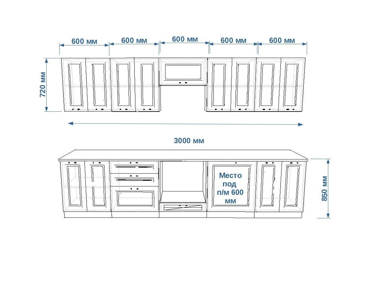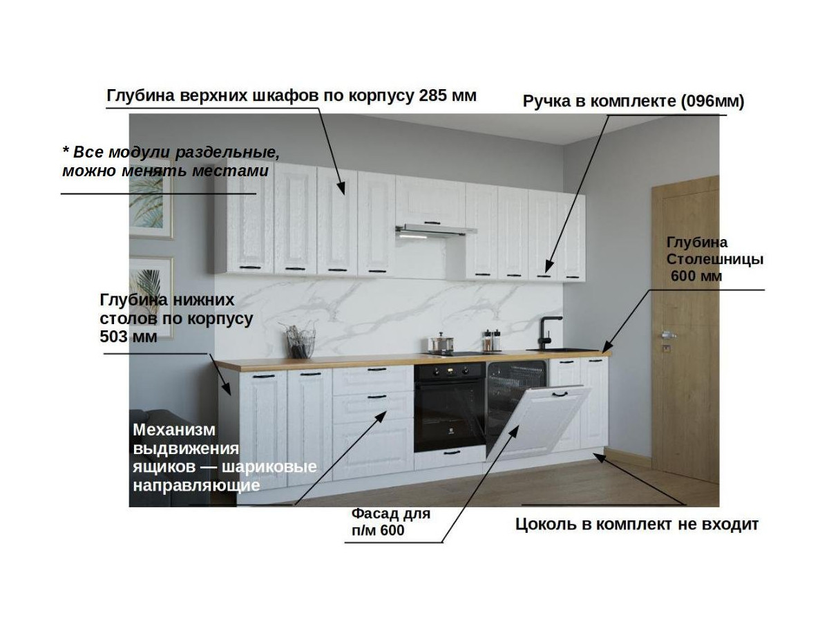 Кухонная мойка, стеновая панель, посудосушитель, планки для столешницы в комплект не входят.