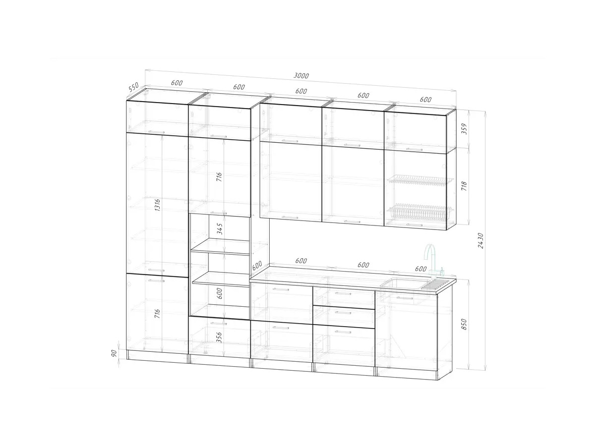 Мойка, смеситель, стеновая панель и посудосушитель в комплект гарнитура не входят.