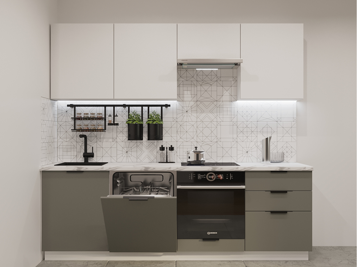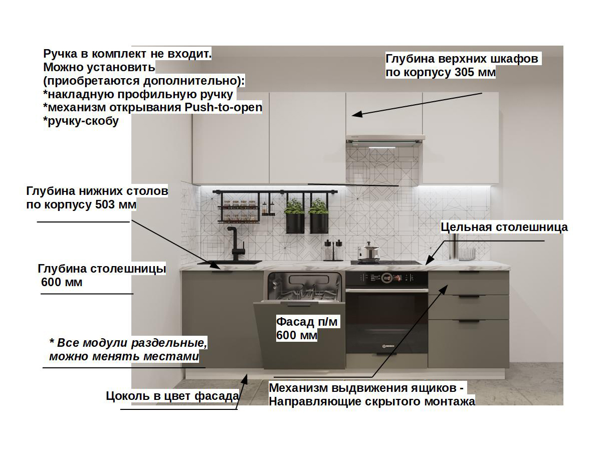 Кухонная мойка, стеновая панель, посудосушитель, планки для столешницы в комплект не входят.