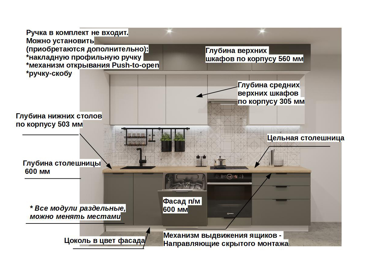 Кухонная мойка, стеновая панель, посудосушитель, планки для столешницы в комплект не входят.