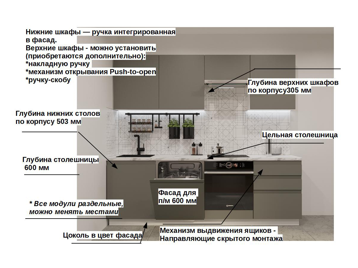 Кухонная мойка, стеновая панель, посудосушитель, планки для столешницы в комплект не входят.