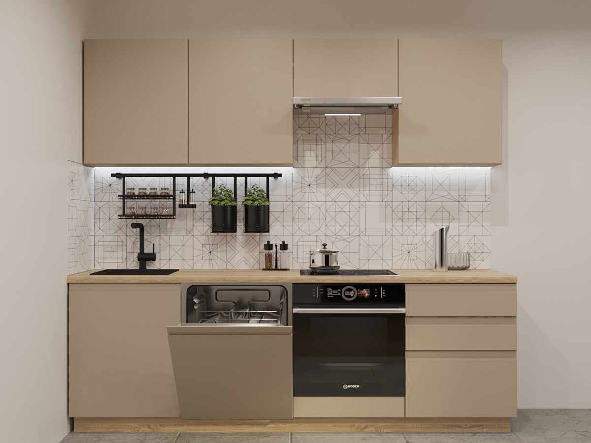 Кухонная мойка, стеновая панель, посудосушитель, планки для столешницы в комплект не входят.
