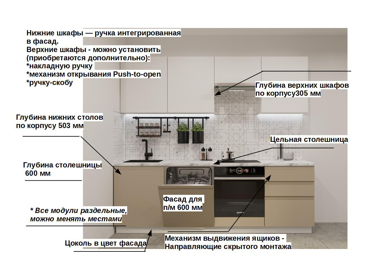 Кухонная мойка, стеновая панель, посудосушитель, планки для столешницы в комплект не входят.