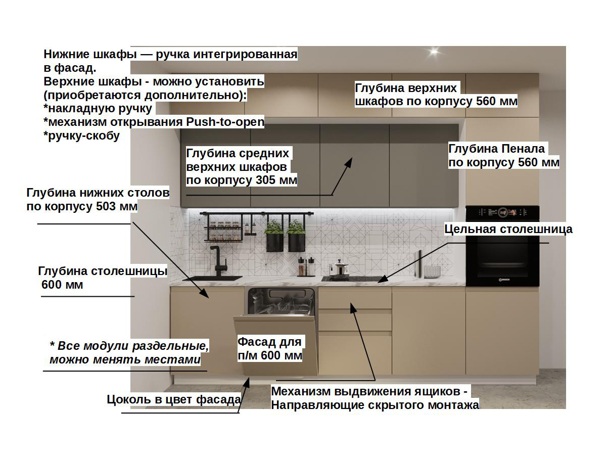 Кухонная мойка, стеновая панель, посудосушитель, планки для столешницы в комплект не входят.