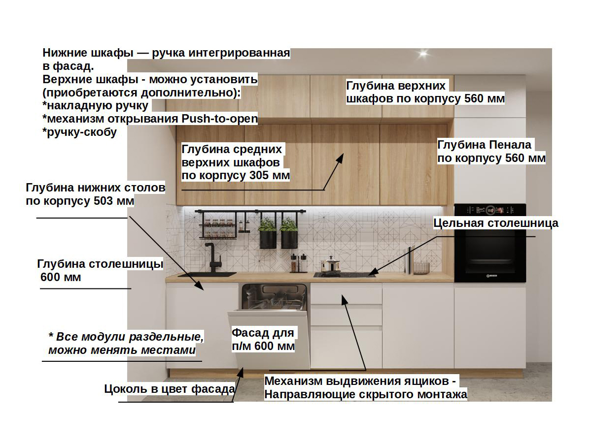 Кухонная мойка, стеновая панель, посудосушитель, планки для столешницы в комплект не входят.