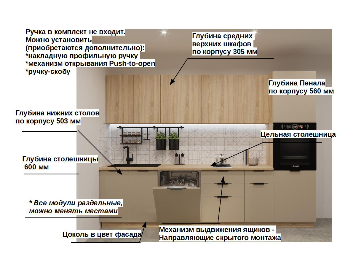 Кухонная мойка, стеновая панель, посудосушитель, планки для столешницы в комплект не входят.