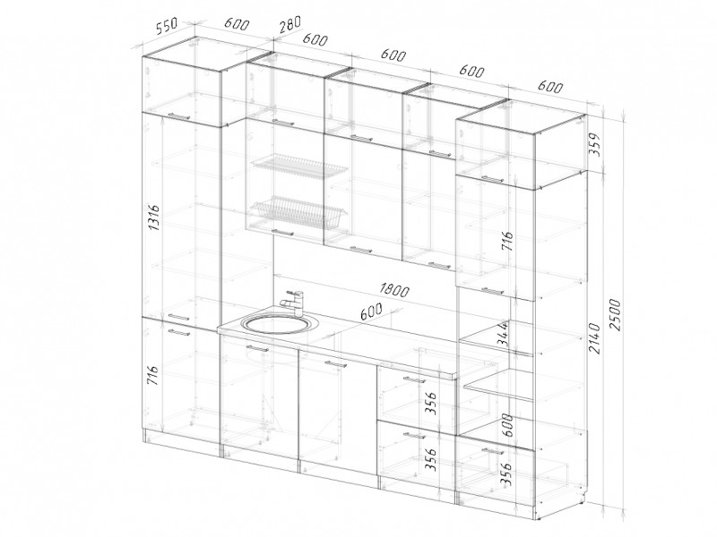Мойка, смеситель, стеновая панель и посудосушитель в комплект гарнитура не входят.