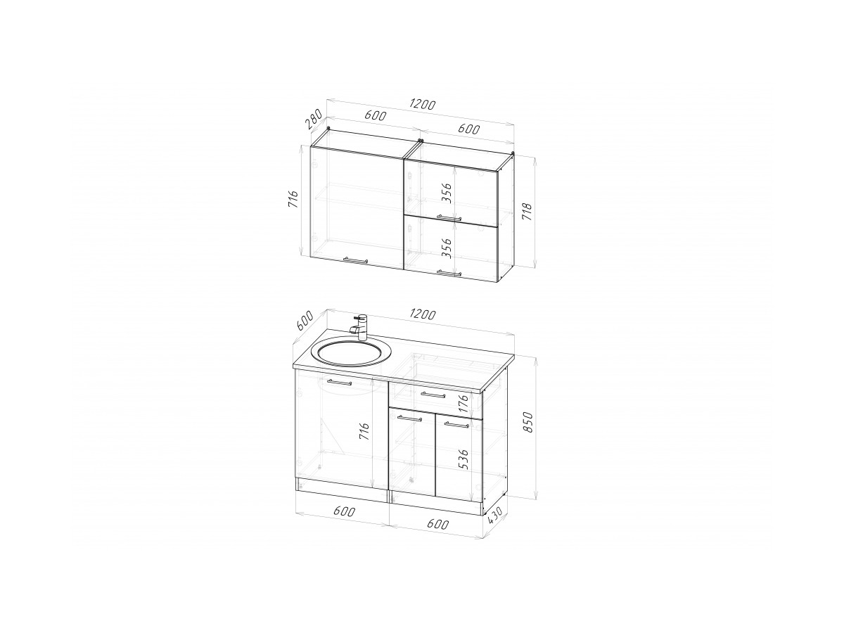 Мойка, смеситель, стеновая панель и посудосушитель в комплект гарнитура не входят.
