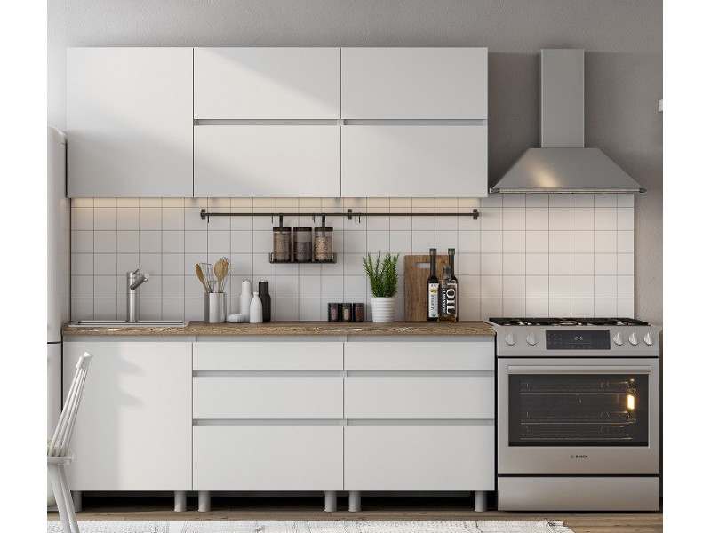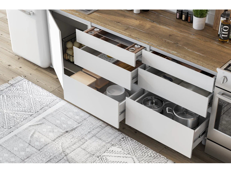 Кухня «Одри» имеет 6 выкатных ящиков на шариковых направляющих и модуль под врезную мойку по своей нижней части, стоит на регулируемых цилиндрических опорах декора «Матовый хром».