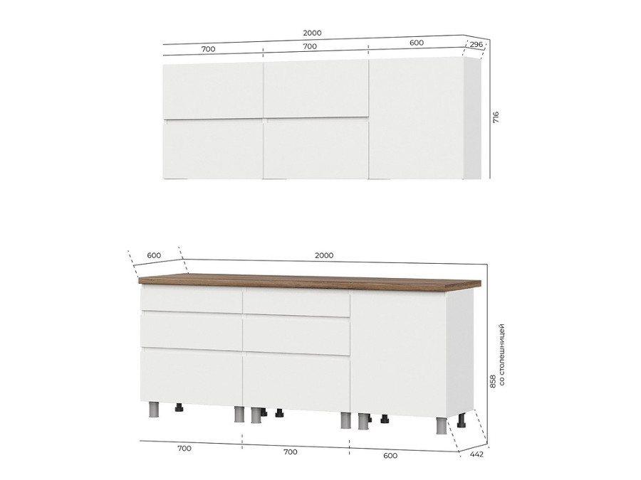 • Низ (с учетом высоты столешницы) 2000х858х600мм