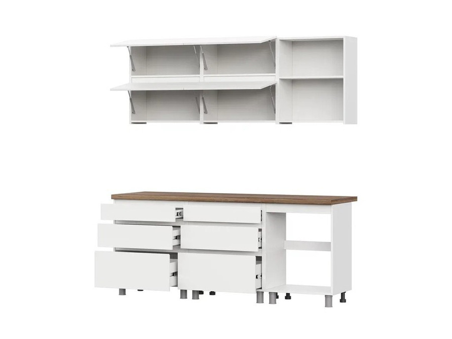 В верхней части кухни установлены 4 отсека для хранения на газлифтах и распашной модуль с полкой для хранения посуды.