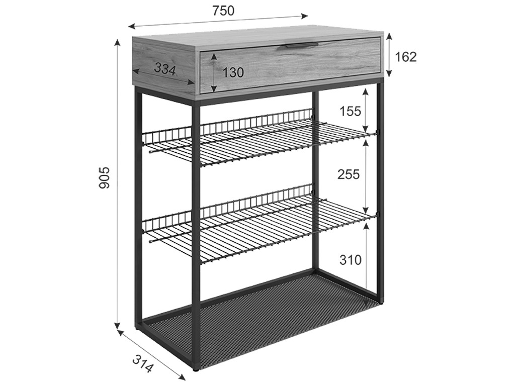 Состоит из: выдвижного ящика, 2-х съемных полок для обуви, эва коврика.