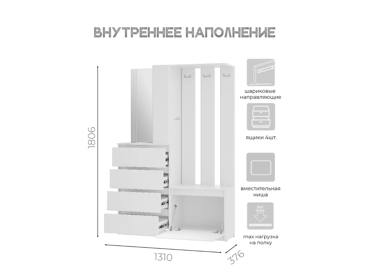 Максимальная нагрузка на полку - 10 кг, на ящик - 5 кг, на крючок - 3 кг.