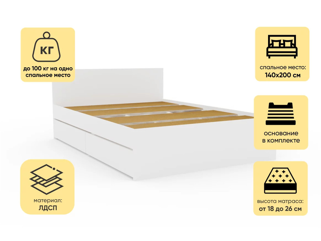 - Кровать Монблан с ящиками 140х200 см Белый