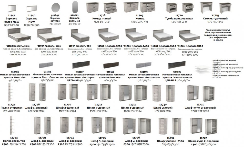 Цена за комплек: Комод малый, Зеркало малое, Шкаф 1-но дверный, Шкаф угловой, Полка открытая, Тумба прикроватная, Кровать Люкс 1600. Ортопедическое основание 1600