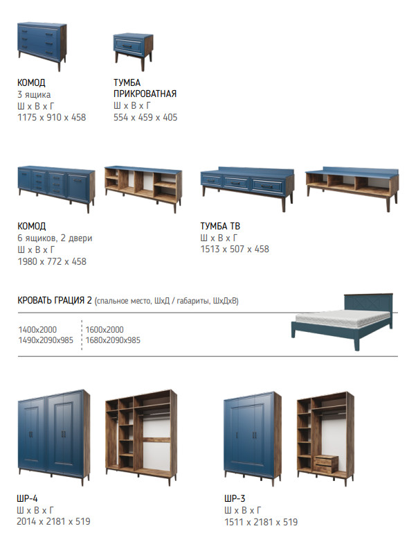 Цена за комплект: кровать ГРАЦИЯ-2 1400, Комплектующие на кровать с ламелями 1400 мм, комод 3 ящика, тумба прикроватная (2 шт)