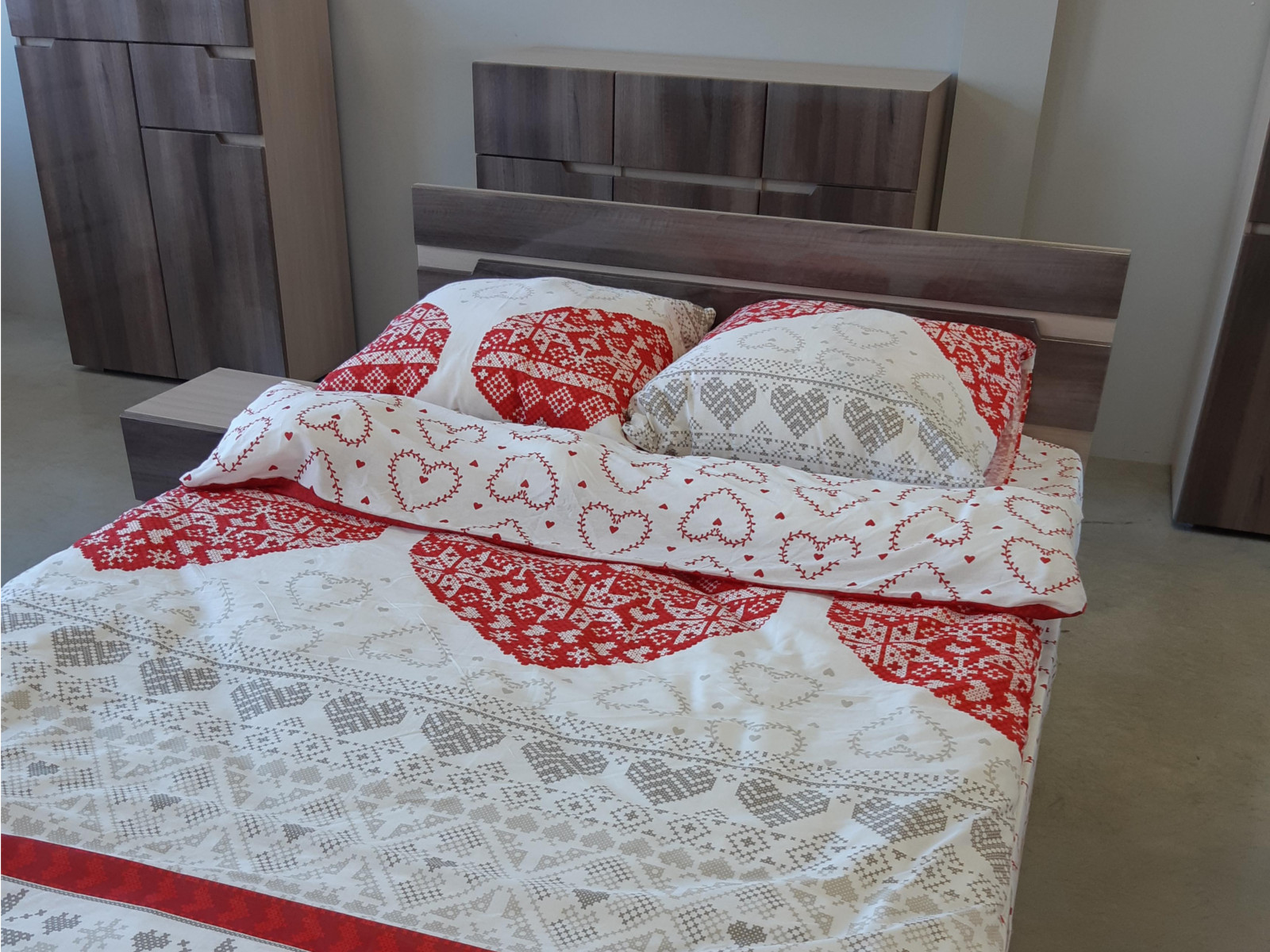Состав комплекта: шкаф 2-х створчатый, шкаф 3-х створчатый, шкаф угловой, пенал , комод-800, тумба прикроватная, комод-1200, кровать-1400, основание 1400, опоры для основания