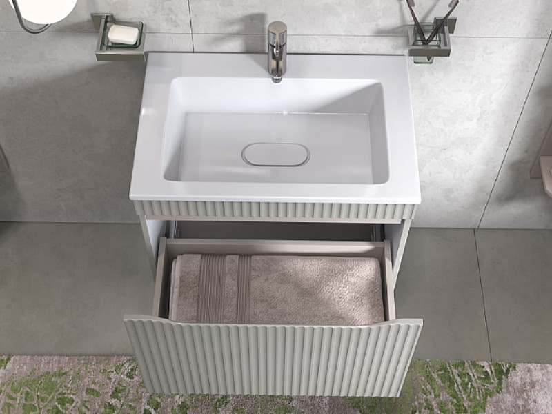Материалы тумбы: влагостойкая МДФ, полимерное покрытие ПВХ, внутренние элементы из ЛДСП, европейская фурнитура