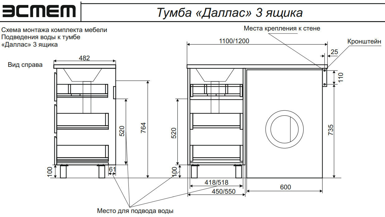 - Тумба с раковиной Dallas Luxe 1150 напольная 3 ящика левая