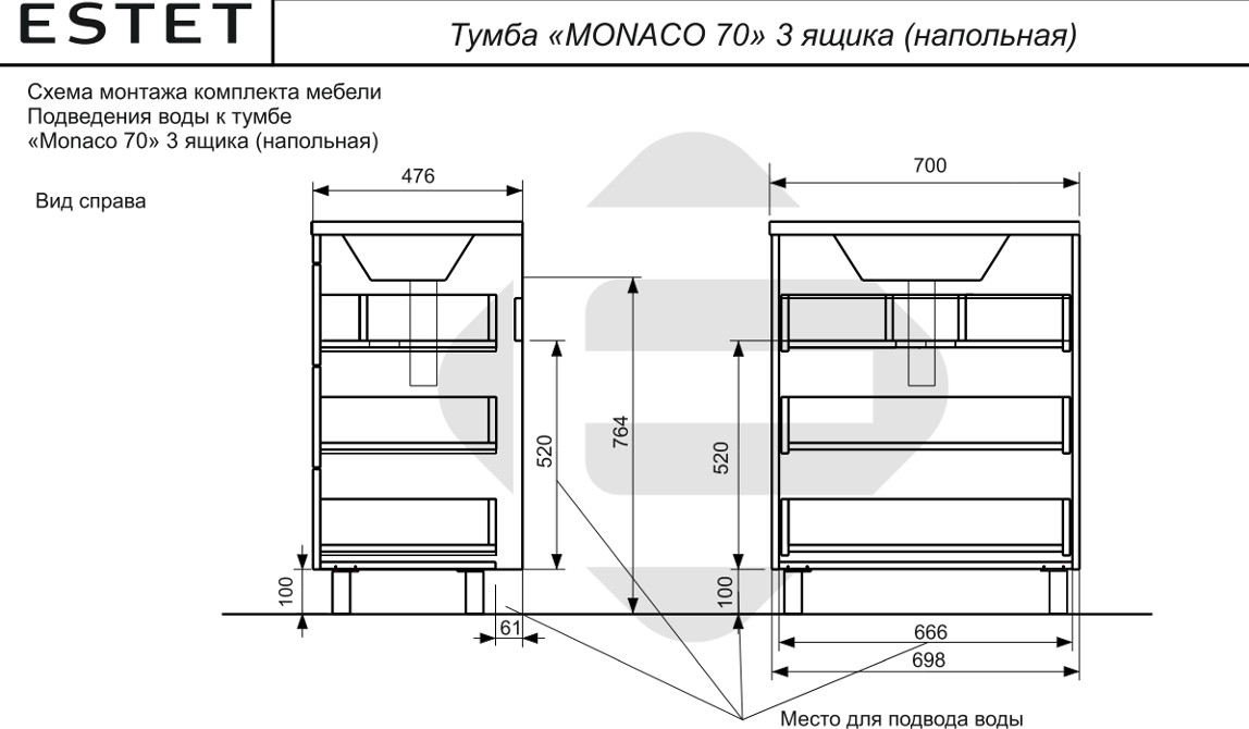 - Тумба с раковиной Monaсo 700 напольная 3 ящика