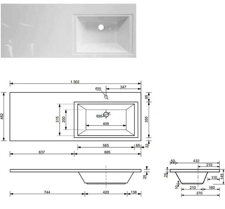 Тумба с раковиной справа Dallas Luxe 1300 навесная 1 длинный ящик