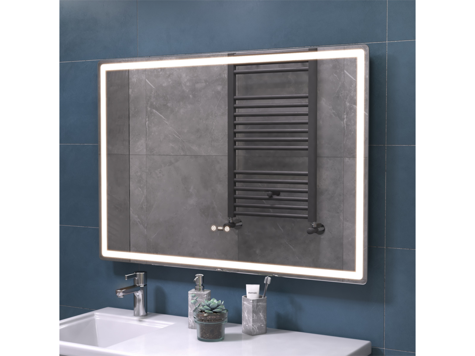 Подсветка фронтальная по периметру, с цветовой температурой 5000К – нейтральный белый, управление подсветкой сенсорное/датчик присутствия (1.5 м.)