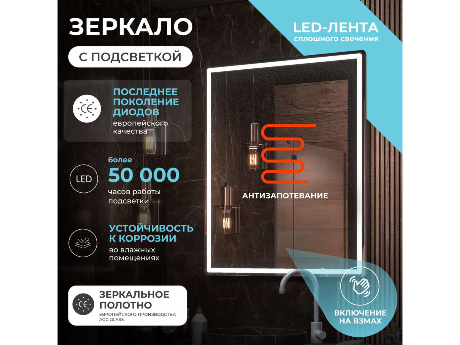 светодиодная подсветка по периметру; сенсорное управление; антизапотевание; включение на взмах