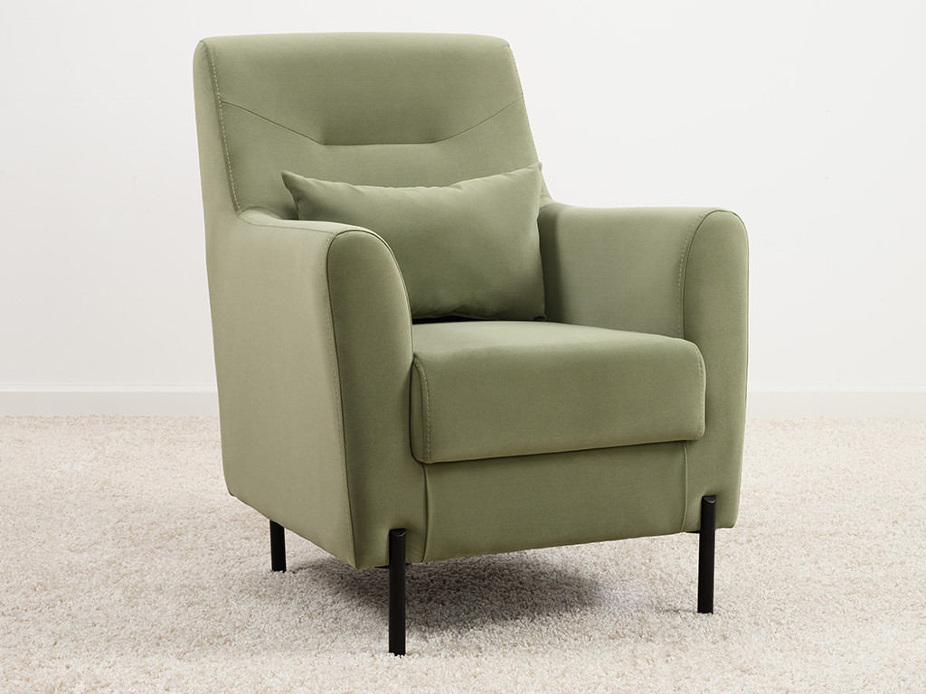 Декоративная утяжка на спинке кресла, декоративная подушка в цвете кресла, металлические опоры переходят в декоративный элемент подлокотника