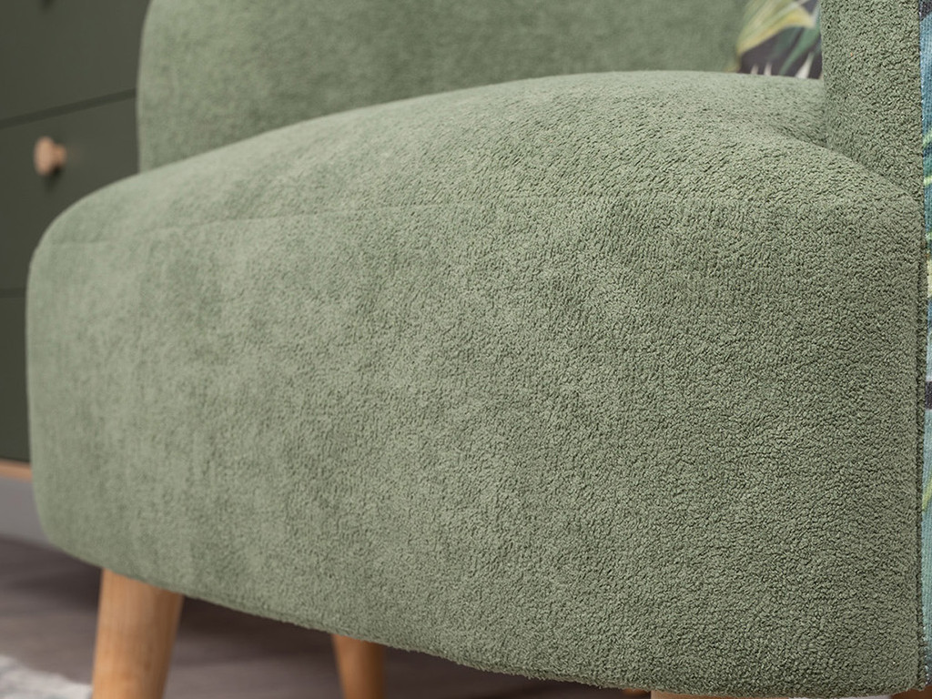Кресло для отдыха на деревянных опорах. Спинка округлой формы переходящая в боковины. Кресло с подушкой думкой квадратной форы из ткани компаньон.