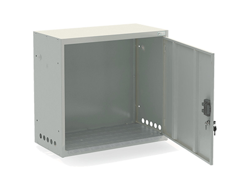 Металлический шкаф состоит из сборно-разборного корпуса и одной распашной двери. Корпус состоит из основания, усиленного оцинкованным настилом, крыши, двух боковых стенок и одной задней стенки. Сборка корпуса осуществляется на винтах и саморезах.