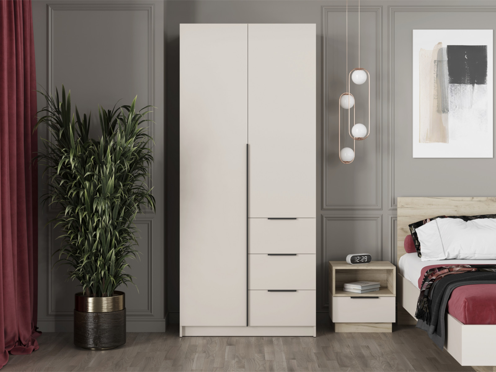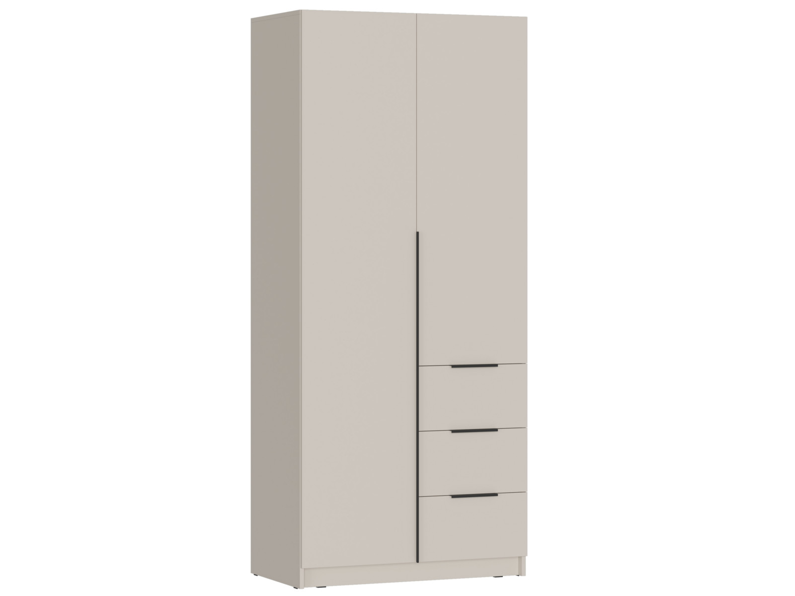 - Левая створка и фасады ящиков имеют ручку – цвет чёрный, материал – пластик.
