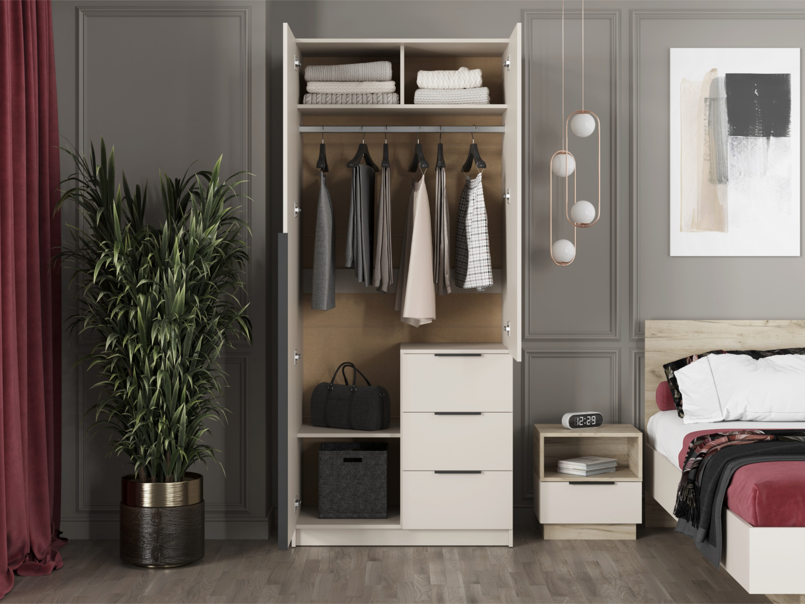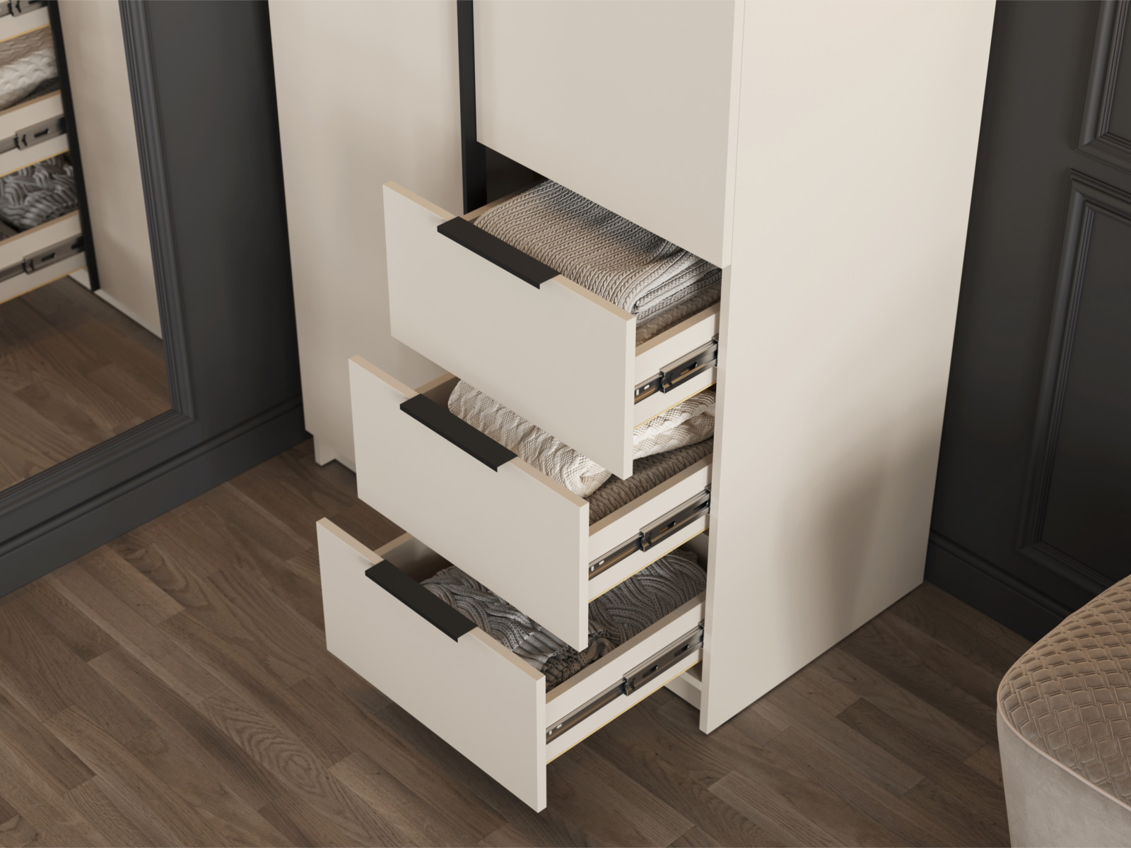 Дно ящиков – ХДФ простое (без цвета) – полностью накладное(набивное). - Также шкаф имеет две створки, за которыми расположены: