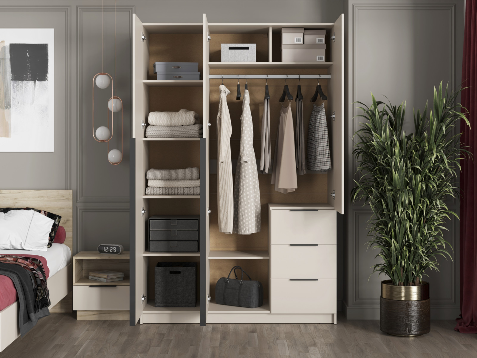 Дно ящиков – ХДФ простое (без цвета) – полностью накладное(набивное). - Также шкаф имеет две левых и одну правую створки.