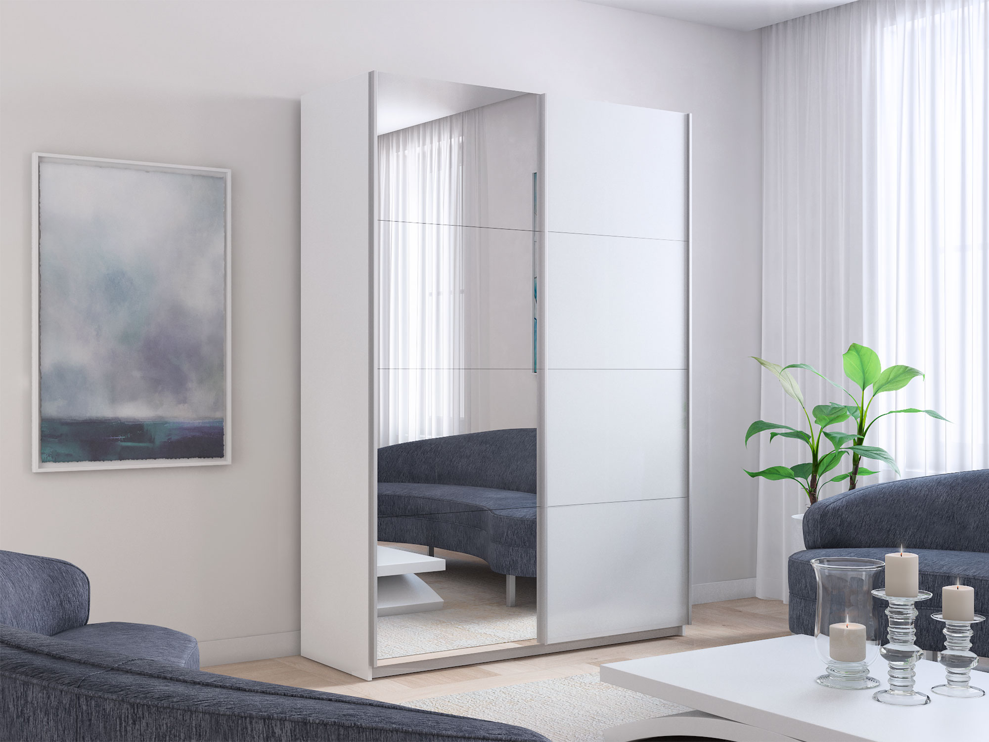 - Шкаф-купе Прайм 2-х дверный 1400 Зеркало/Стекло Белое Белый Снег
