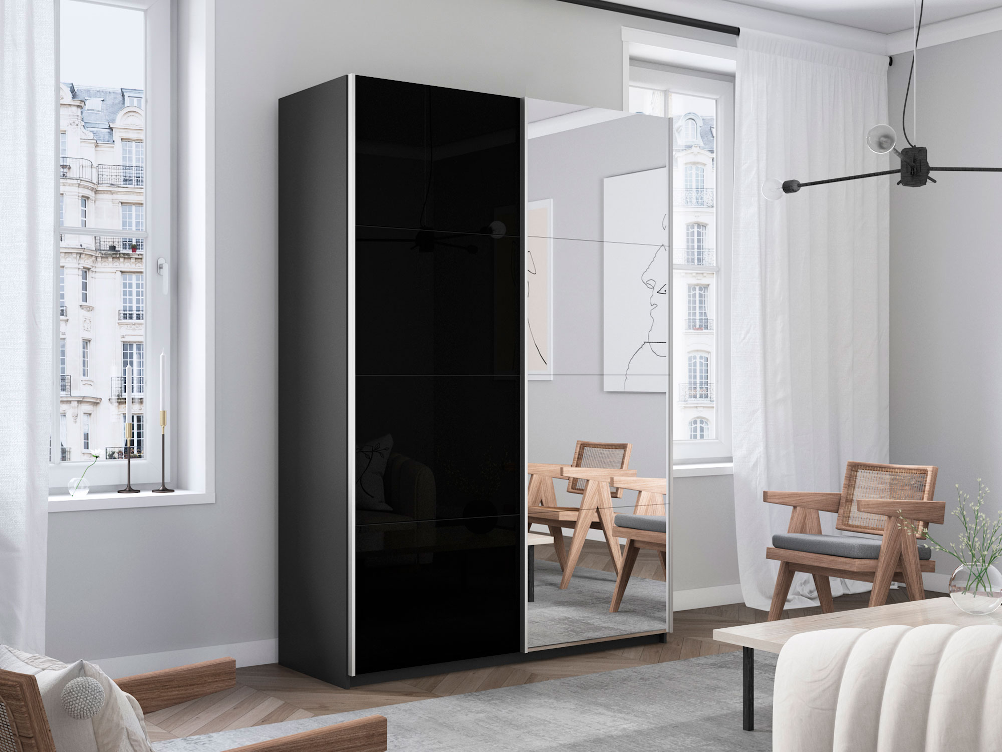 - Шкаф-купе Прайм 2-х дверный 1400 Зеркало/Стекло Черное Серый Диамант