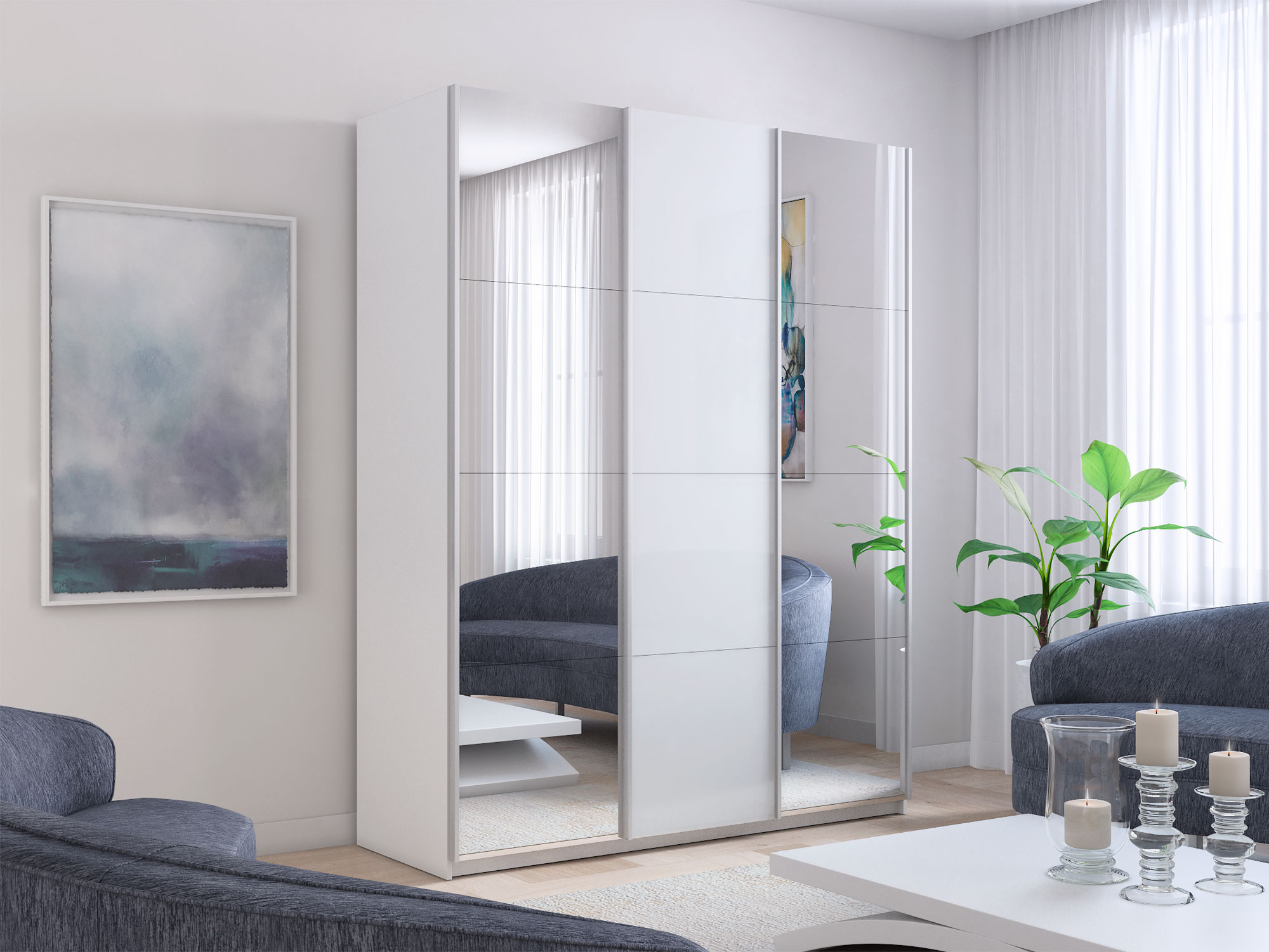 Шкаф-купе Прайм 3-х дверный 2100 Зеркало/Стекло Белое/Зеркало Белый Снег