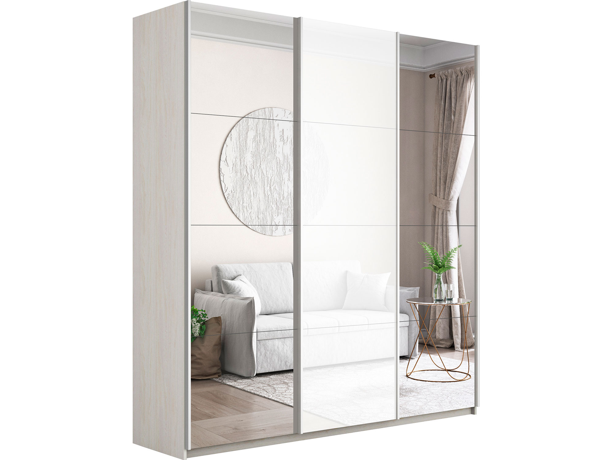 - Шкаф-купе Прайм 3-х дверный 2100 Зеркало/Стекло Белое/Зеркало Ясень Анкор Светлый