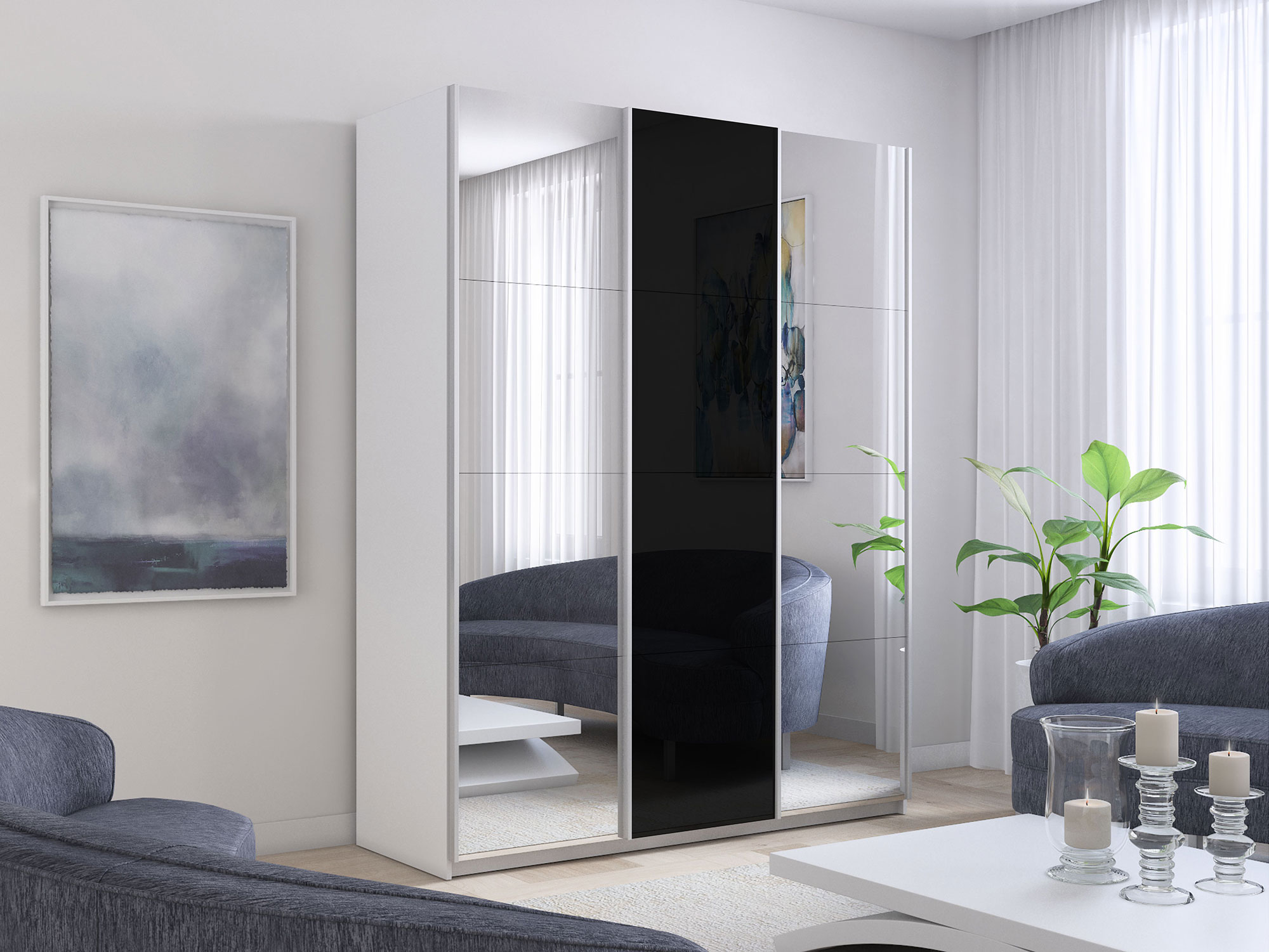 - Шкаф-купе Прайм 3-х дверный 2100 Зеркало/Стекло Черное/Зеркало Белый Снег