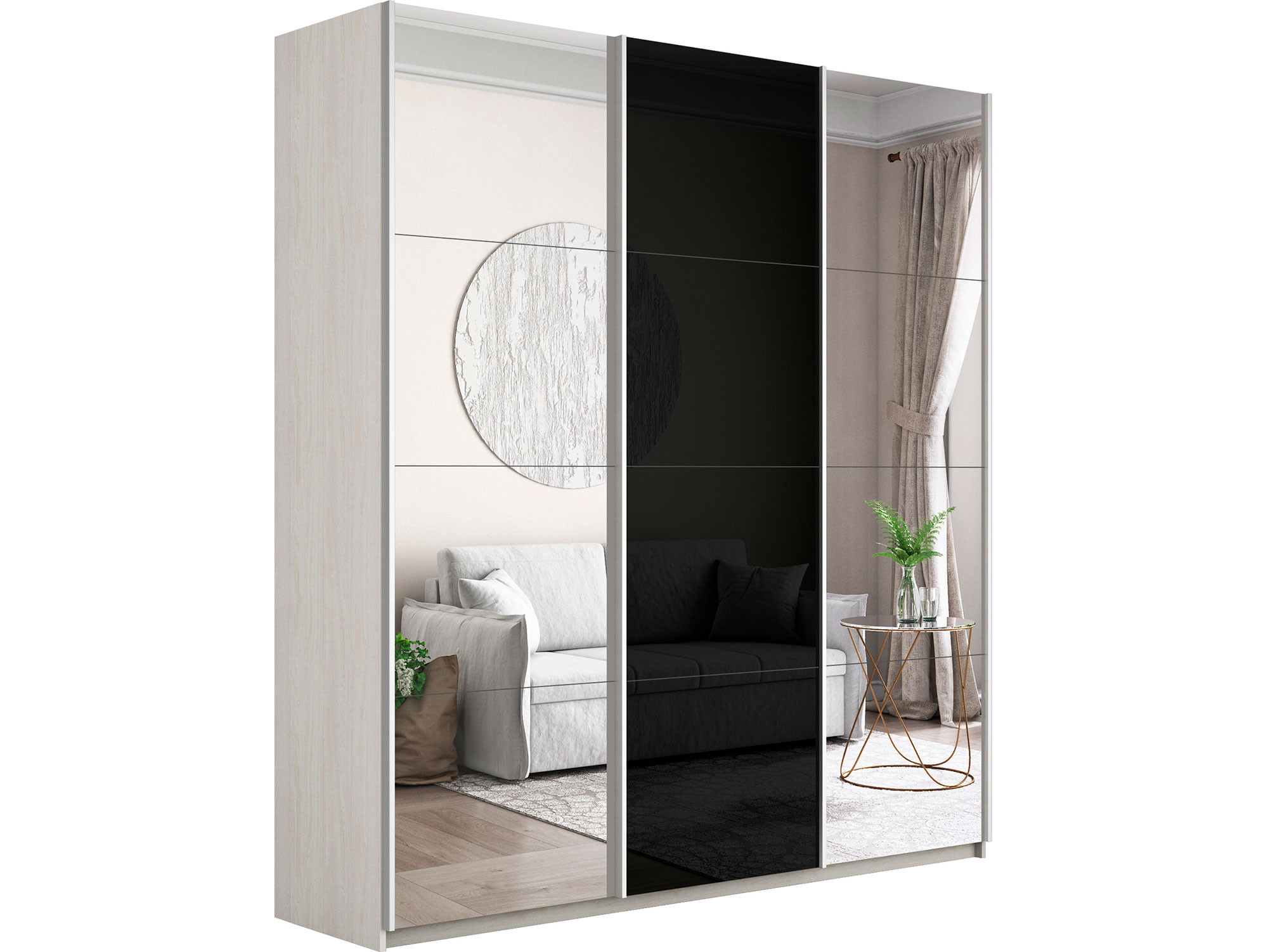 - Шкаф-купе Прайм 3-х дверный 2100 Зеркало/Стекло Черное/Зеркало Ясень Анкор Светлый