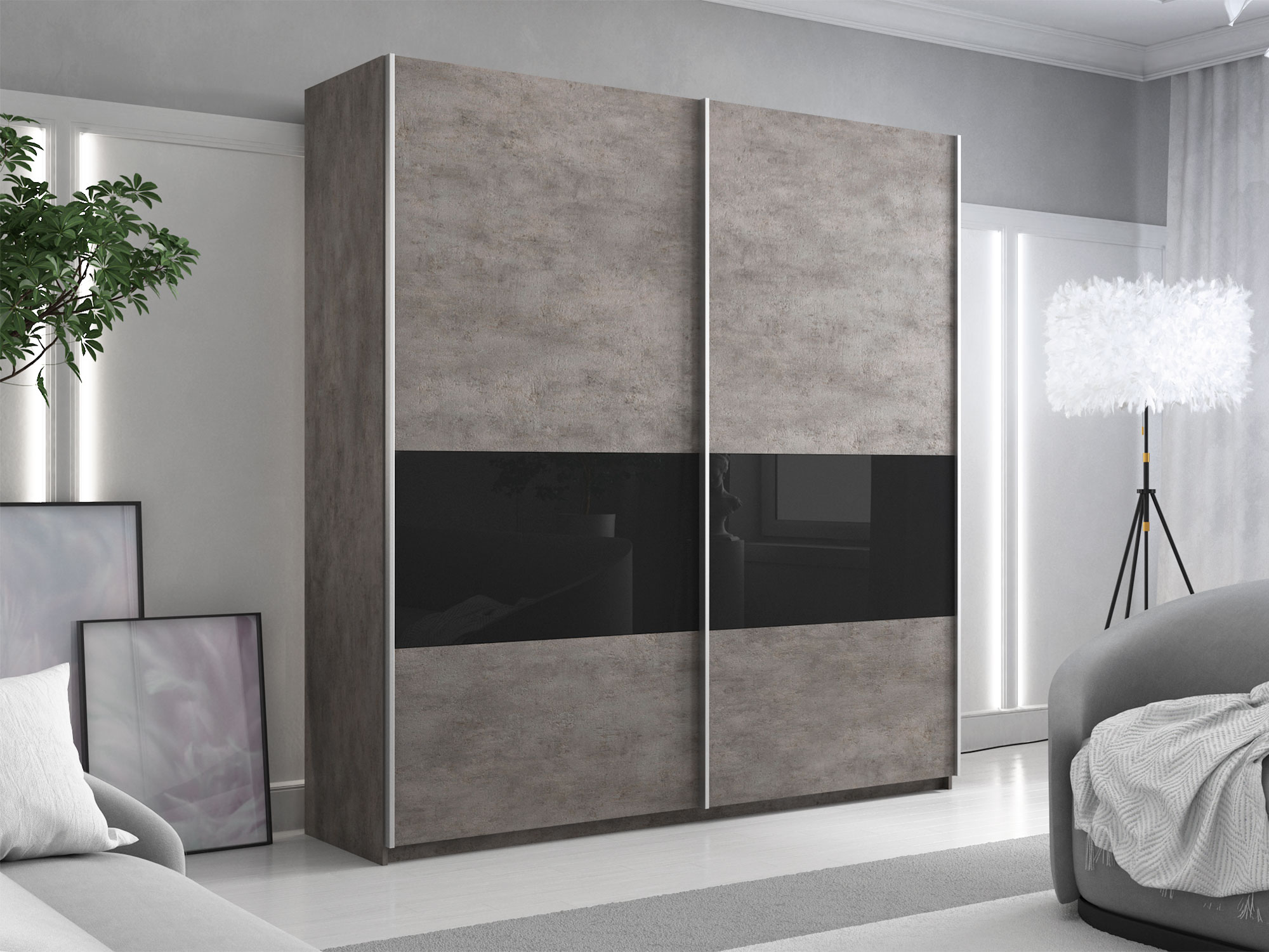 Шкаф-купе Прайм Широкий 2-х дверный ДСП/вставки Стекло Черное Бетон